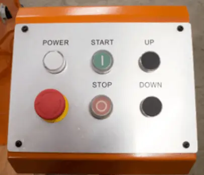 1. Стойка управления с двумя ножными педалями и кнопкой аварийной остановки, снабжена удобной ручкой для переноски