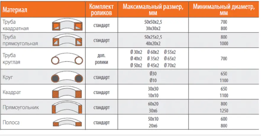 В комплектации стандартный комплект роликов для изгибания квадратной и профильной трубы, а также прямоугольника максимального размера 60х20 с минимальным диаметром 800мм