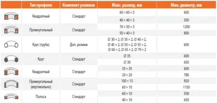 Максимальный размер труб - 60х60х3, 70х50х3, 80х40х3 мм