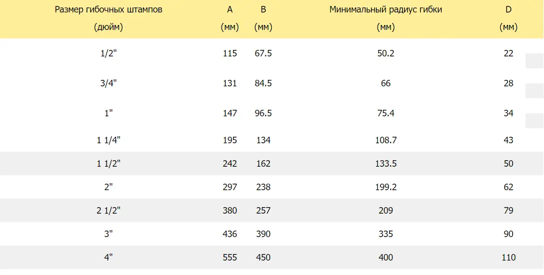 Гибка производится в одной плоскости, макс. угол гибки 90°. При необходимости трубы макс. диаметров нужно набивать песком.