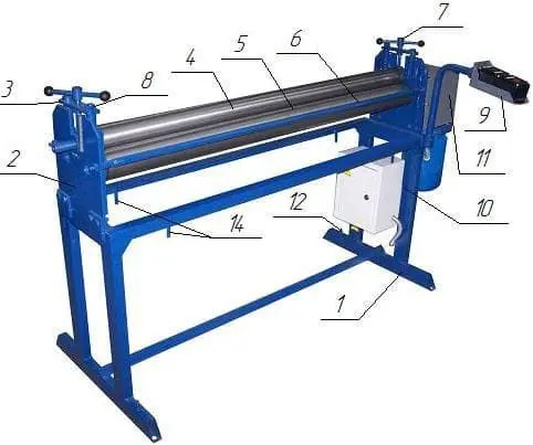 С помощью прижимных винтов 7 поднять вверх прижимной вал 4. Вальцуемый лист 13 расположить между опорными 5 и прижимным 4 валами «рис.2» (заготовка должна располагаться параллельно валам). Далее одновременным (равномерным) вращением прижимных винтов 7 опускаем постепенно (1/2 оборота) прижимной вал 4 на величину, необходимую для формирования требуемого радиуса вальцевания. Вальцевание листа осуществляется вращением электромеханического привода (связанного с опорными валами через шестерни), при помощи нажатия реверсивных кнопок на выносном пульте 9. Смена возвратно-поступательного движения валов осуществляется через кнопку СТОП. Для извлечения заготовки 13 возвращаем прижимной вал 4 в верхнее положение с помощью вращения прижимных винтов 7. При необходимости снятия прижимного вала ослабить фиксирующую гайку, отвести прижимную балку на 180° и вывести из зацепления винт 7 подъёмного устройства.