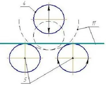 С помощью прижимных винтов 7 поднять вверх прижимной вал 4. Вальцуемый лист 11 расположить между опорными 5 и прижимным 4 валами рис.2 (заготовка должна располагаться параллельно валам). Далее одновременным вращением прижимных винтов 7 опускаем постепенно ( 1/2 оборота) прижимной вал 4 на величину, необходимую для начала формирования требуемого радиуса вальцевания. После каждого опускания прижимного вала 4 вальцуемый лист 11 прокатывается по всей плоскости с помощью вращения приводной рукоятки 8 механического привода (связанного с опорными валами через шестерни ).