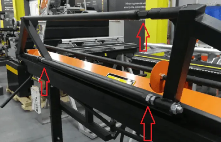 Верхняя прижимная балка соединена с основной балкой - боковыми узлами с поворотно-прижимными регулирующими опорами на подшипниках, что увеличивает срок службы основных частей станка. Подшипники на осях поворотной балки шприцуются.