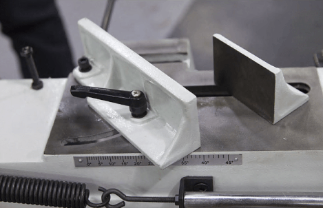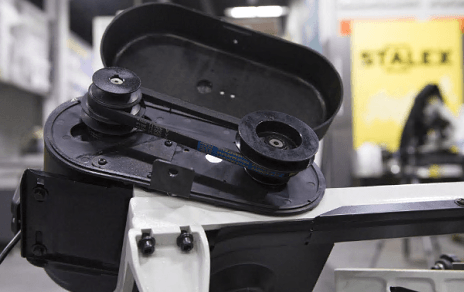 Станок оснащен ременной передачей, поворотными тисками с углом наклона 45-90 градусов, устойчивой конструкцией с транспортировочными колесами, ограничителем длины реза, регулировкой натяжения пильного полотна, дополнительным столом при резке плиты в вертикальном положении рамы
